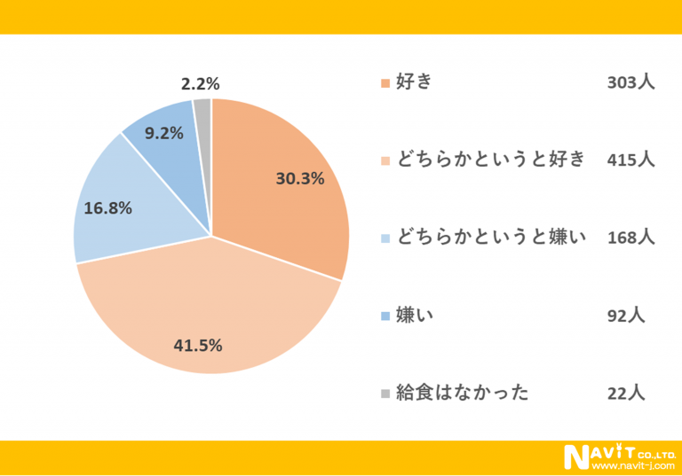 「給食は好きでしたか?(または好きですか?)」という質問については、「好き」が30.3%、「どちらかというと好き」が41.5%という結果になり、合わせると71.8%の人が給食を好きだったことが分かりました。