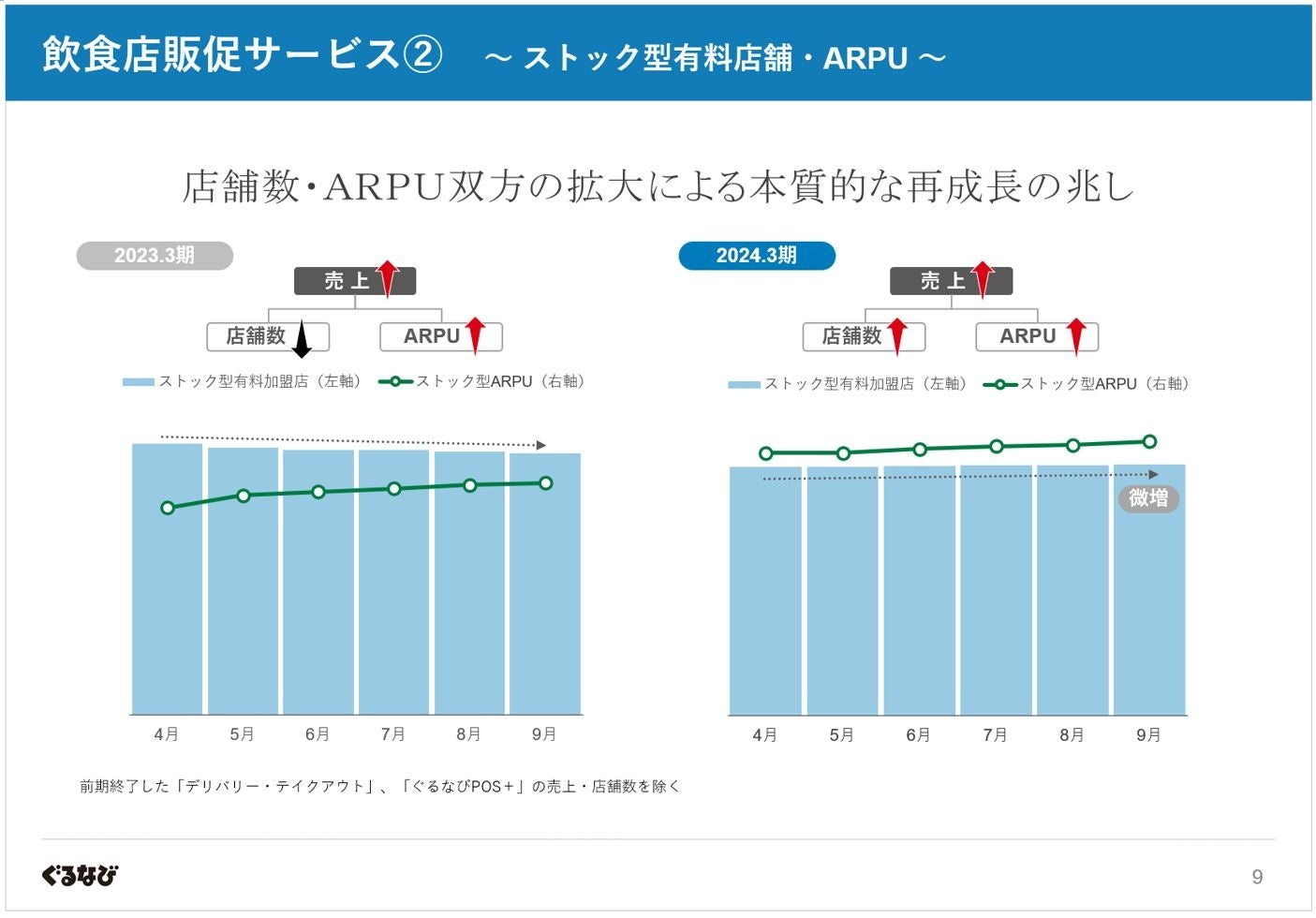3月にマスク着用ルールが緩和され、5月にはコロナの感染症法上の分類が5類へ移行したことをきっかけに飲酒を伴う外食支出が回復し、飲食店の販促に対する意識は改善傾向にあることを背景に、より集客効果の高いの加盟プランへの切り替えや追加の商品利用が活発化し、1店舗あたりの契約高(以下「ARPU」といいます。)が上昇したのに加え、減少が続いていたストック型有料加盟店舗数が5月に底打ちし緩やかながらも増加基調に転じ、ARPU・店舗数双方の拡大による本質的な再成長の兆しが見られます。