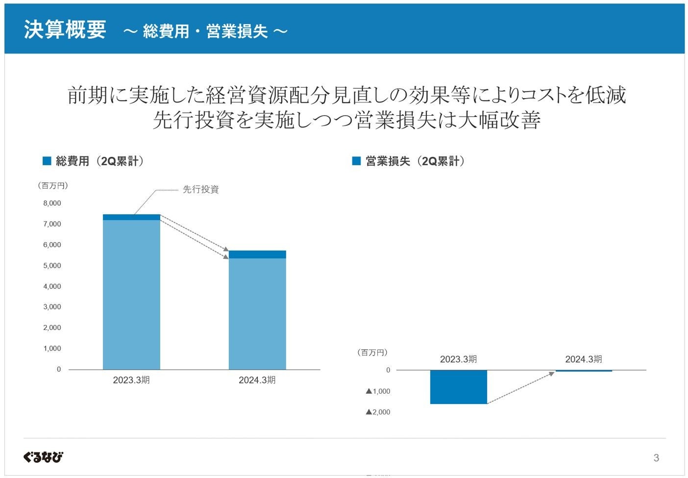 そして、費用については注力サービスの絞り込みや高いコスト意識の浸透により、未来に向けた先行投資を継続・強化しつつも低減。その結果、営業損失は前年同期より大幅に縮小し着地しました。