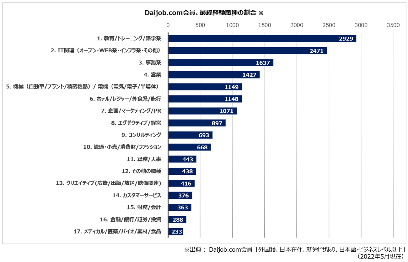 1番多かった最終経験職種は、外国人だからこそ仕事に活かしやすい言語能力が必要な「教育/トレーニング/語学系」になり、続いて「IT関連」、「事務系」という結果になりました。日本での滞在経験があまりない人が、初めて日本で就く職種として、語学教師を選ぶことが多くなっています。