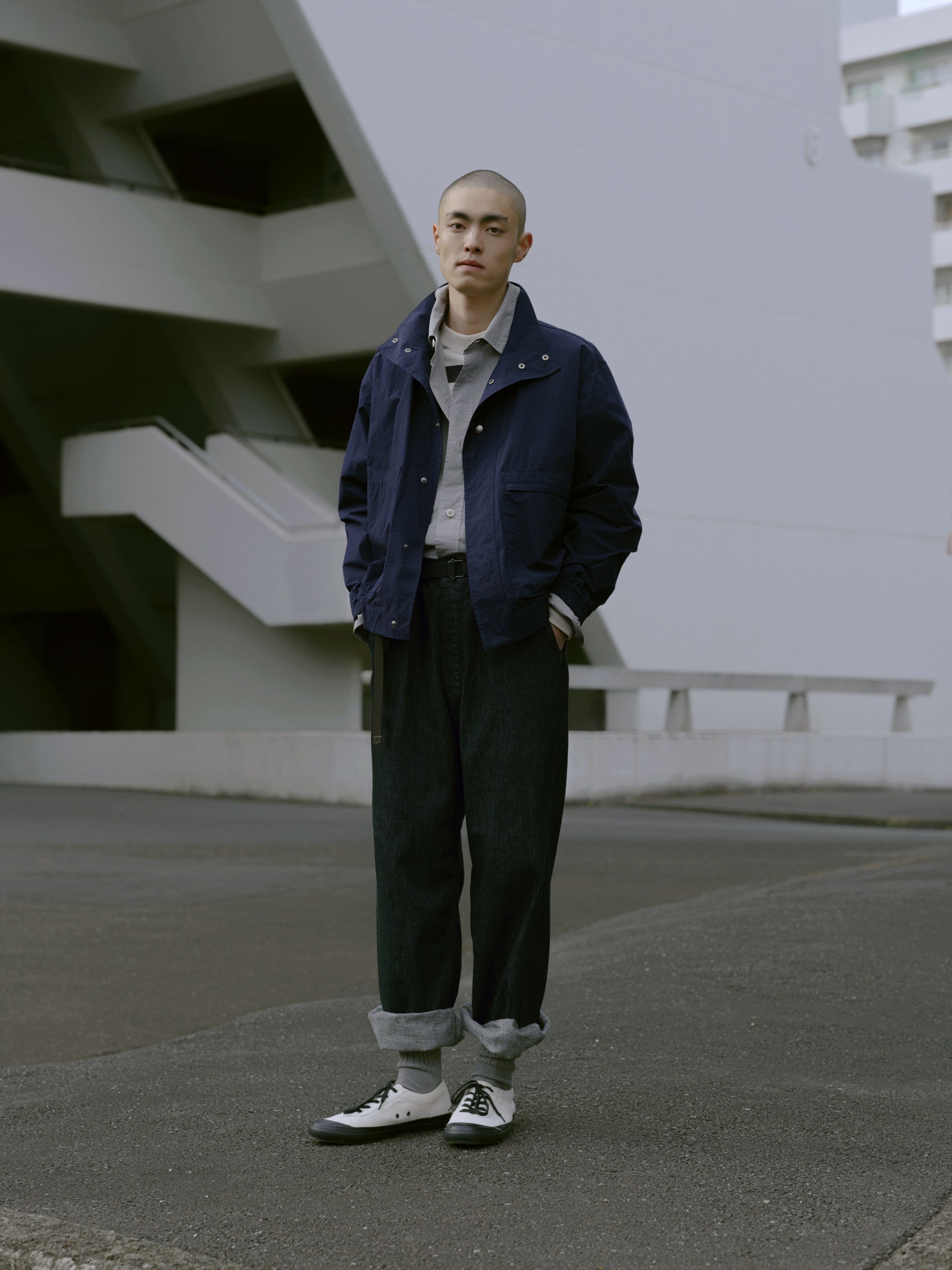ミリタリーのウォータープルーフジャケットをリファレンスした一着。ブランドらしいドット釦付きのフライフロントを加えモダンな印象に。腰ポケットはサイドを縫い止めず実用的な設計がされている。