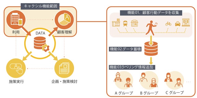 顧客行動可視化サービス「キャクシル」は、SDKを既存のスマホアプリに埋め込むだけで顧客の位置/行動情報を取得できるほか、自社Payやスマートキーなど顧客のUX向上や利便性をもたらすDX機能を追加することが可能です。また、これらの利用情報をラベリングした状態でお客様に還元しますので、これまでは見えていなかった顧客行動の一面をデータとして取得できます。この情報を分析・活用いただくことで適切な方法とタイミングで有効なターゲットにマーケティング施策を打ち出すことが可能になります。