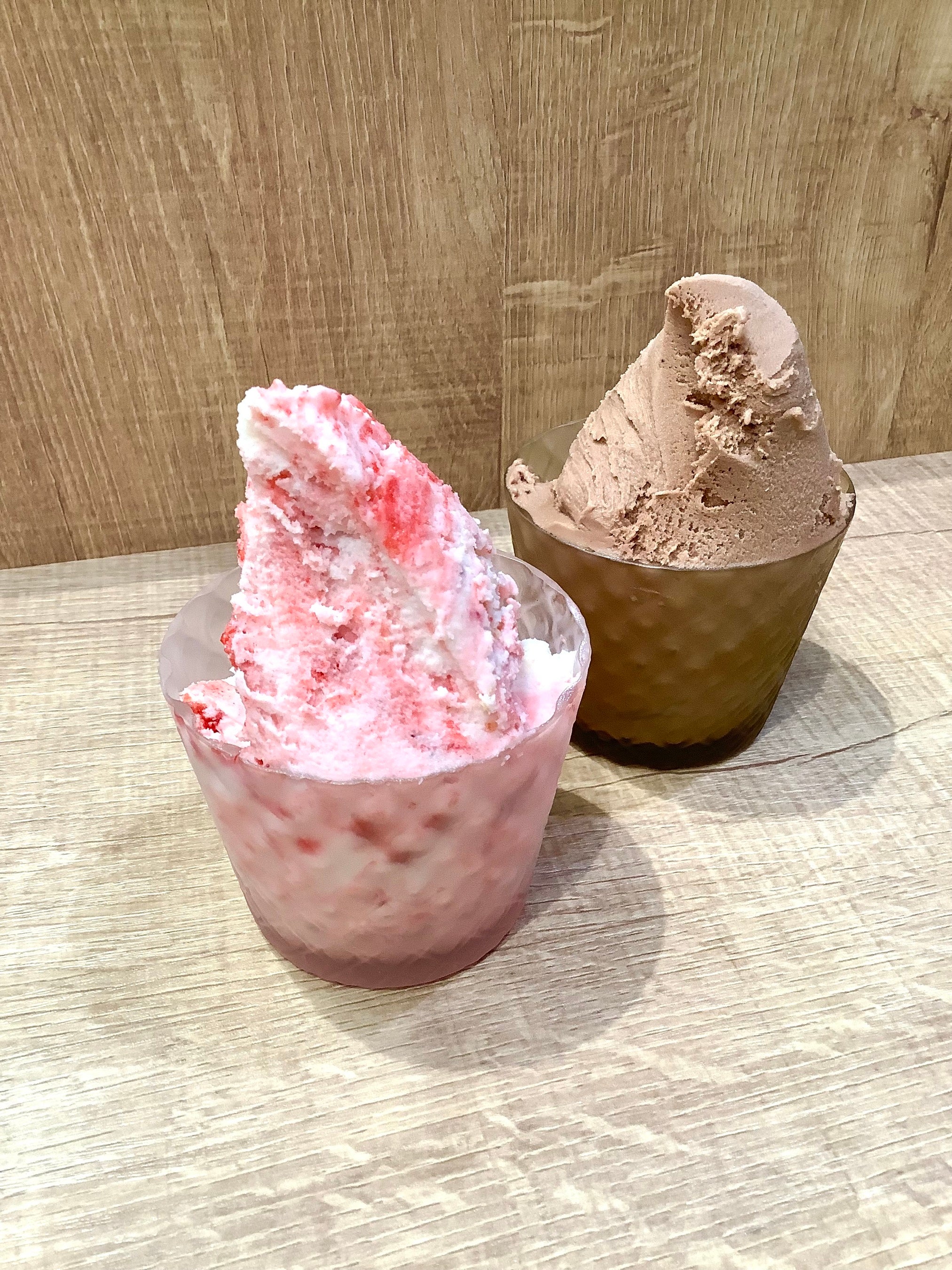 お茶の伊藤園が手がける、日本の味をジェラートで! 人気のイチゴとみるくのミルフィーユジェラート(左)。初登場のチョコレートジェラートも登場(右)。抹茶ジェラートとのペアがおすすめの季節限定商品。