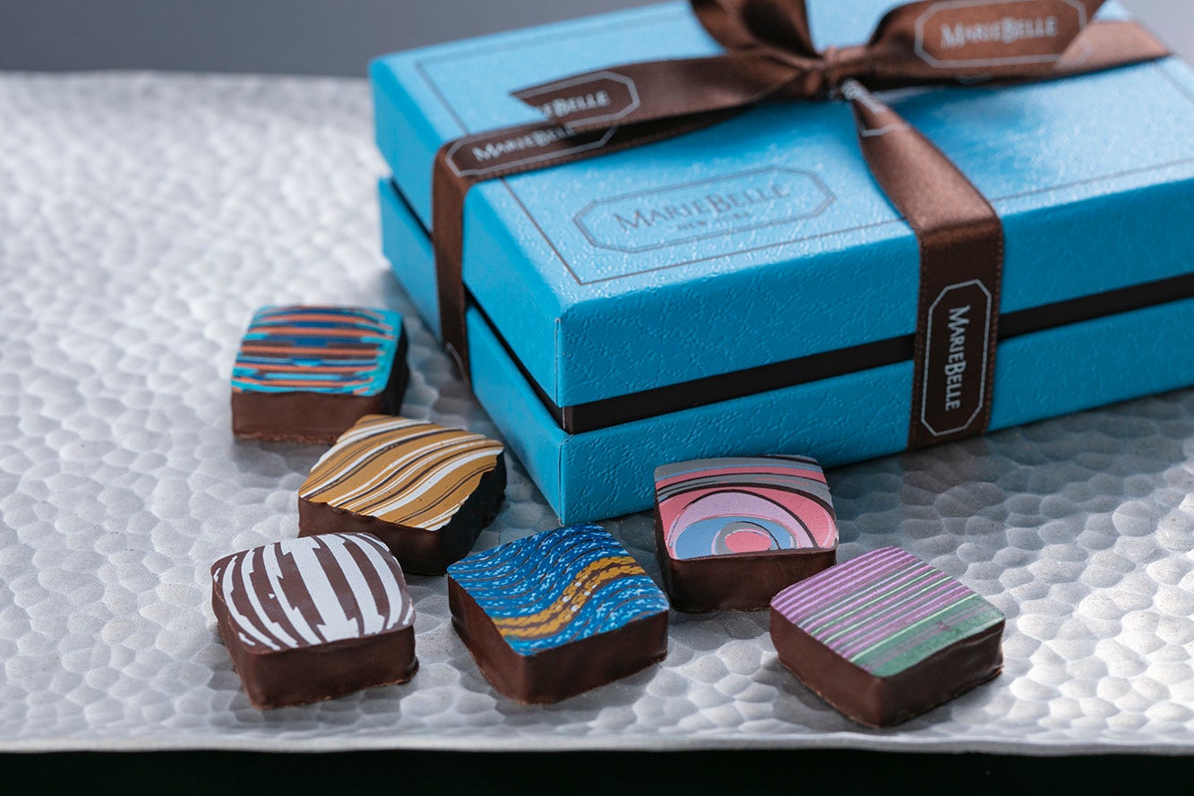 NYの人気チョコレート店「マリベル」。ひと粒ひと粒にアーティスティックなデザインをプリント。絵柄でフレーバーが違う今年の限定品。 ブルーボックス(ジャックコレクション、6個入り) 税込3,888円