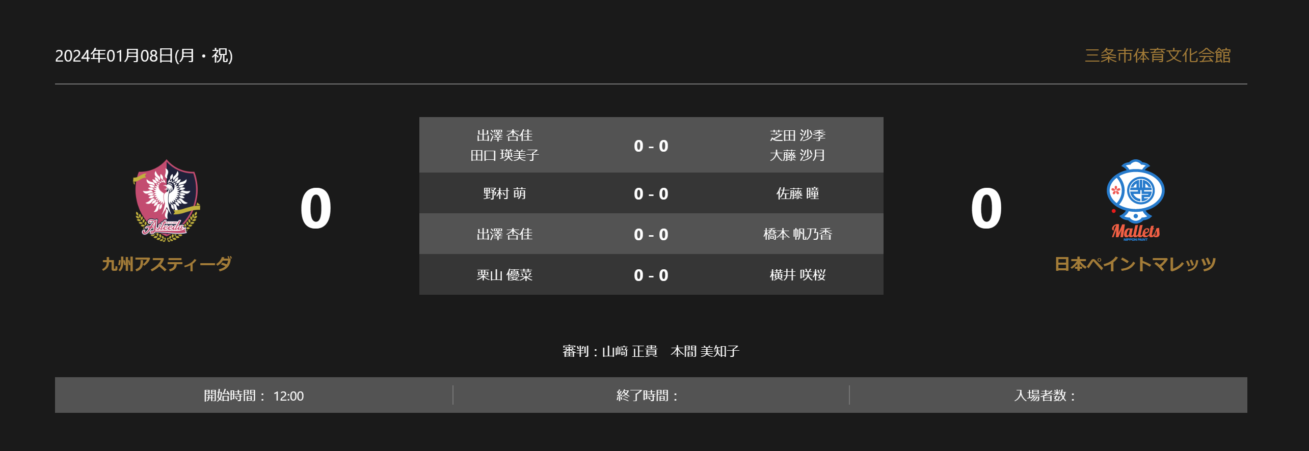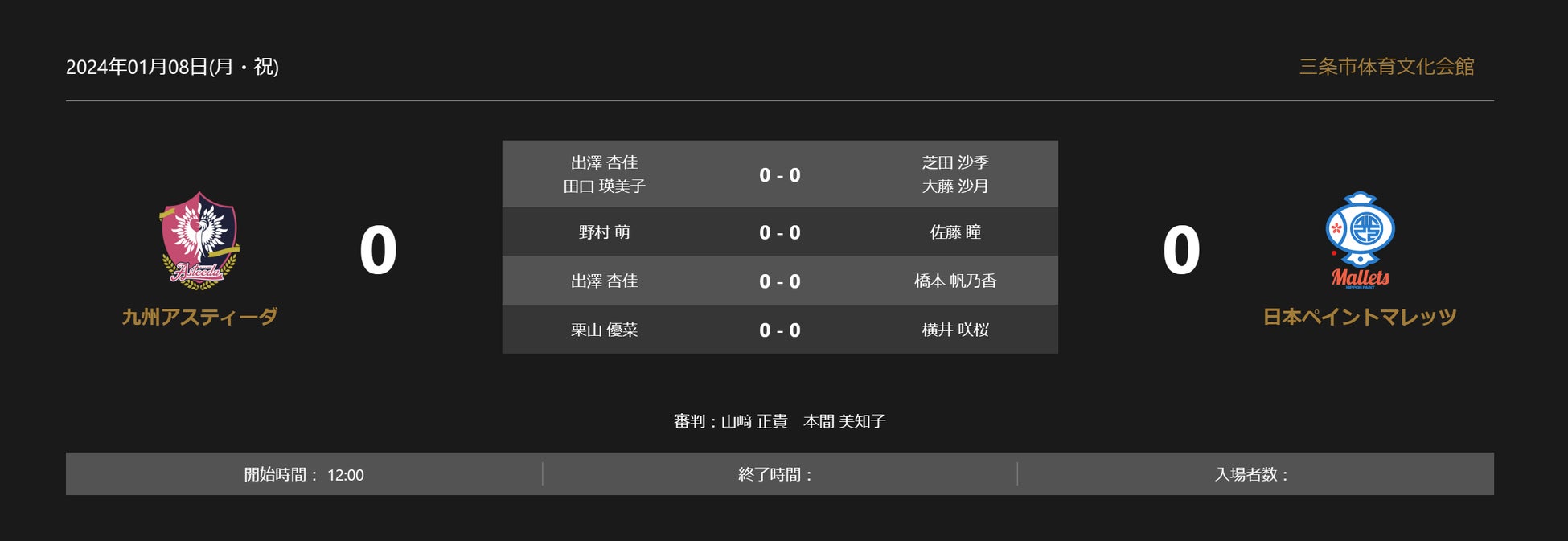 ノジマTリーグ 2023-2024シーズン 公式戦 1月8日開催 九州アスティーダ vs 日本ペイントマレッツ 対戦オーダー発表