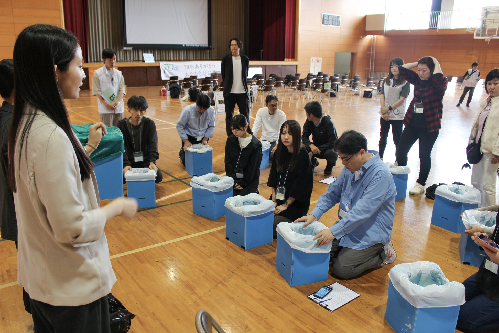 さらに、避難所生活の衛生環境を大きく左右するのが“トイレ”の問題。避難所では断水によりトイレが使えないケースも多く、携帯トイレや簡易トイレの活用が重要になります。そこで本プログラムでは、一般社団法人日本トイレ協会に協力いただき、簡易トイレの設置体験も行いました。