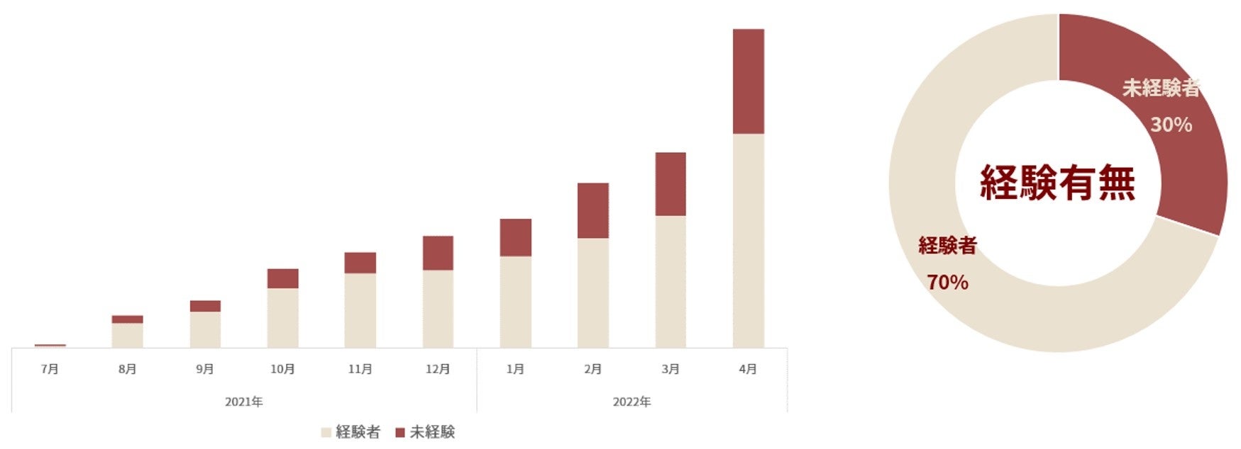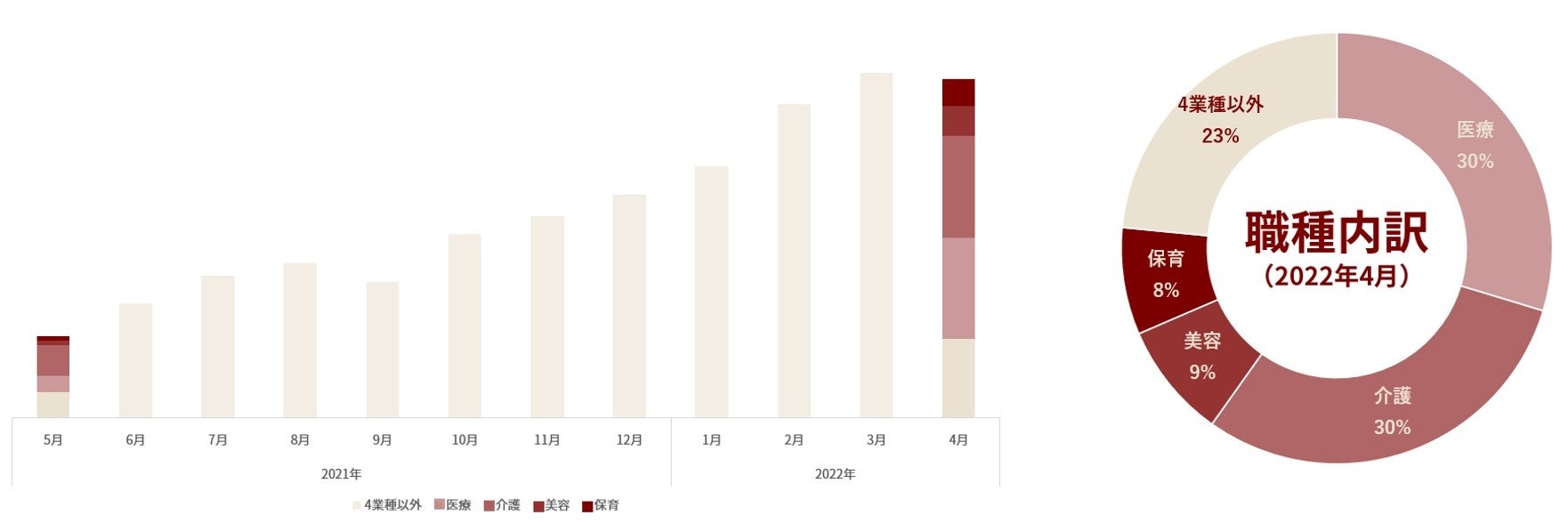 医療・介護・保育・美容など専門職の有効求人倍率は、新型コロナウイルス感染症拡大以前から高い水準で推移しており、労働力不足は喫緊の課題となっております。当社は昨年5月、企業と資格・経験を保有する方、新たにプロフェッショナルとしての活躍を目指す方をつなぐ専門職の総合求人サイト「バイトル PRO 」を開始、1年が経過し求人件数は50万件と大幅に伸長、同様に採用者数も増加しております。採用者数の内訳は経験者約7割、未経験者約3割を占め、PROを目指す採用者の4割は20代が占めております。専門職の中でも医療、介護の採用者数が多く、構造的な労働力不足の課題解決につながる就業機会増加の役割を果たしているといえます。