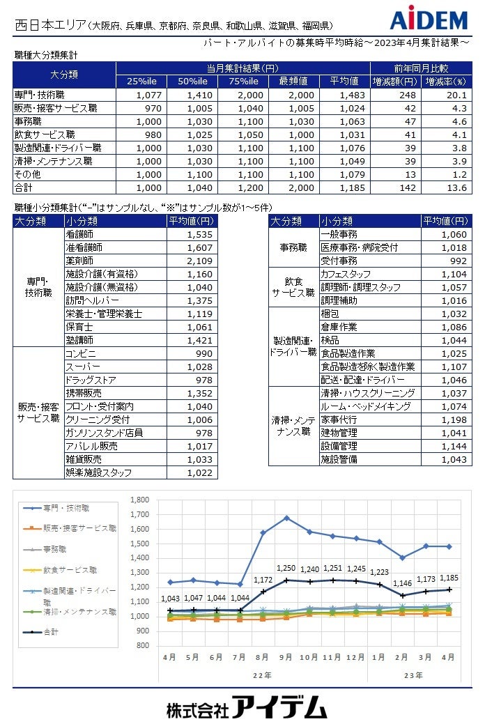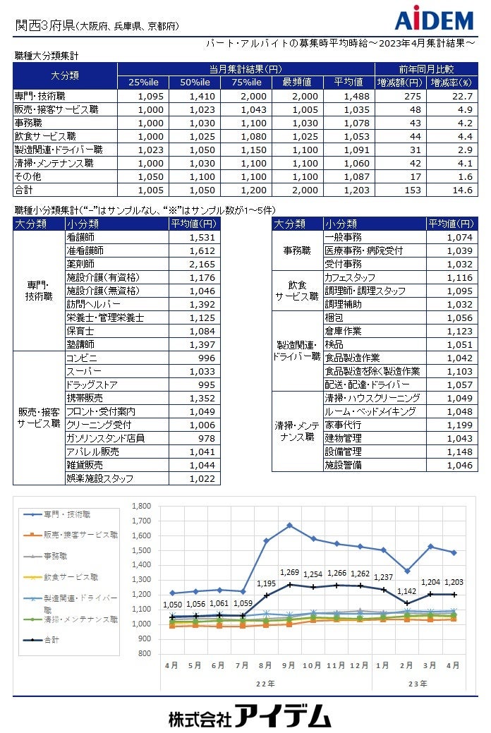 職種大分類別の平均時給は、「専門・技術職」1,488円(前年同月比275円増)、「製造関連・ドライバー職」1,091円(同31円増)、「事務職」1,078円(同43円増)、「清掃・メンテナンス職」1,060円(同42円増)、「飲食サービス職」1,053円(同44円増)、「販売・接客サービス職」1,035円(同48円増)の順で、前年同月比で全ての職種がプラスとなった。府県別の平均時給は、大阪府1,273円(前年同月比192円増)、兵庫県1,128円(同120円増)、京都府1,113円(同62円増)の順となり、前年同月比で全ての府県がプラスとなった。
