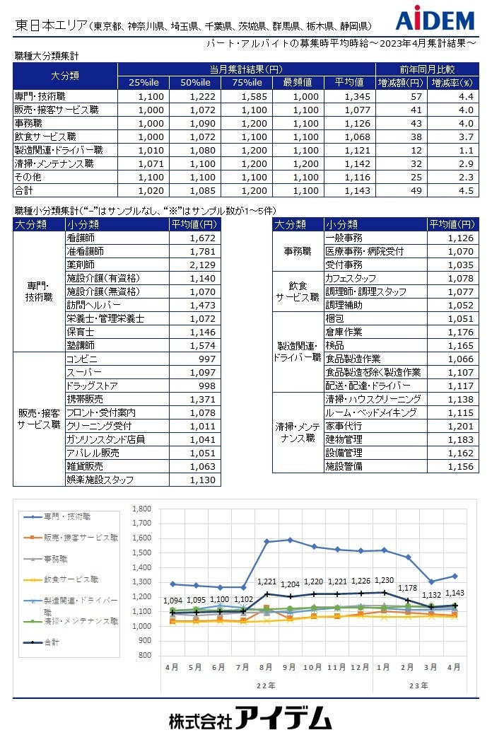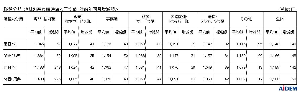 職種大分類別の平均時給は、「専門・技術職」1,483円(前年同月比248円増)、「製造関連・ドライバー職」1,076円(同39円増)、「事務職」1,063円(同47円増)、「清掃・メンテナンス職」1,049円(同39円増)、「飲食サービス職」1,031円(同41円増)、「販売・接客サービス職」1,024円(同42円増)の順で、前年同月比で全ての職種がプラスとなった。