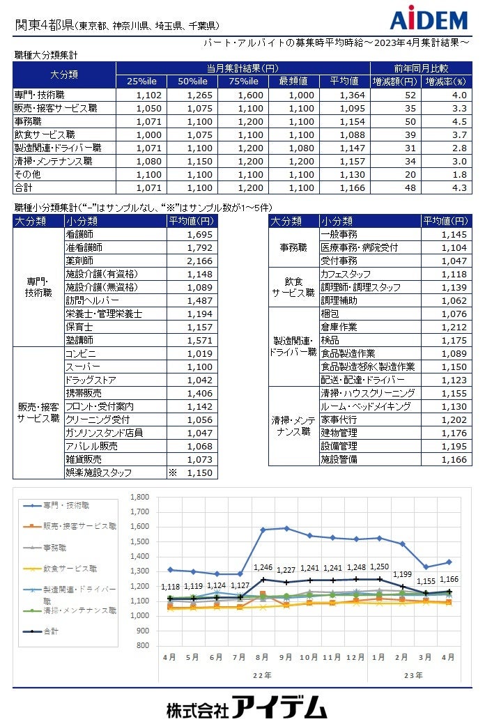 職種大分類別の平均時給は、「専門・技術職」1,364円(前年同月比52円増)、「清掃・メンテナンス職」1,157円(同34円増)、「事務職」1,154円(同50円増)、「製造関連・ドライバー職」1,147円(同31円増)、「販売・接客サービス職」1,095円(同35円増)、「飲食サービス職」1,088円(同39円増)の順で、前年同月比で全ての職種がプラスとなった。都県別の平均時給は、東京都1,202円(前年同月比36円増)、神奈川県1,172円(同43円増)、千葉県1,119円(同54円増)、埼玉県1,117円(同61円増)の順となり、前年同月比で全ての都県がプラスとなった。