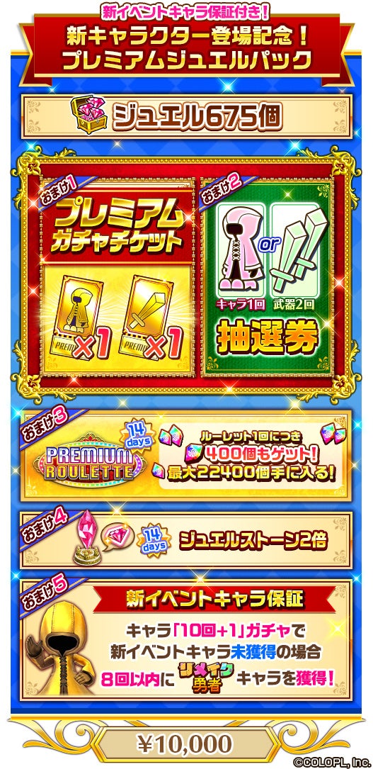 ・内容物(1回目):「ジュエル」675個、「キャラ1体or武器2個抽選券」1枚、「プレミアムキャラガチャチケット」1枚、「プレミアム武器ガチャチケット」1枚、「新イベントキャラ保証」、「プレミアムデイリールーレット」14日間、「ジュエルストーン2倍」14日間