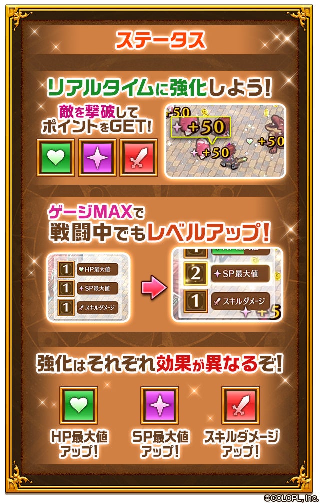 また、クエスト内で敵を倒すと「勇者レベル」が上がり、キャラクターのステータスが強化されていきます。魔王城の最後に待ち構える魔王ソアラとの対決に向けて、「勇者レベル」の育成を忘れないようにしましょう。
