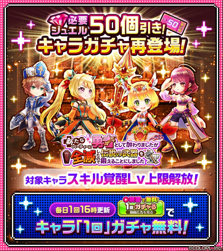 「勇者」シリーズの最新作開催を記念して、2021年に開催したイベント「新たなパーティーに勇者として加わりましたが全滅したので伝説の武器を鍛えることにしました」のキャラガチャが再登場しております。