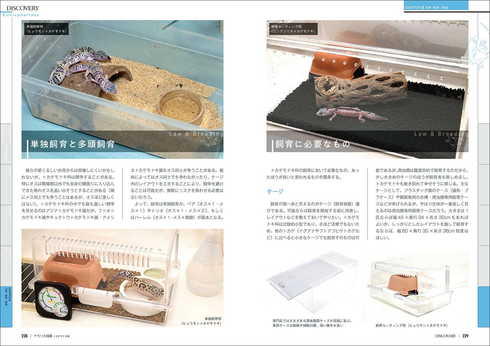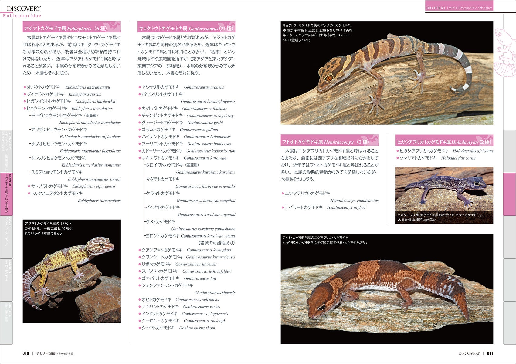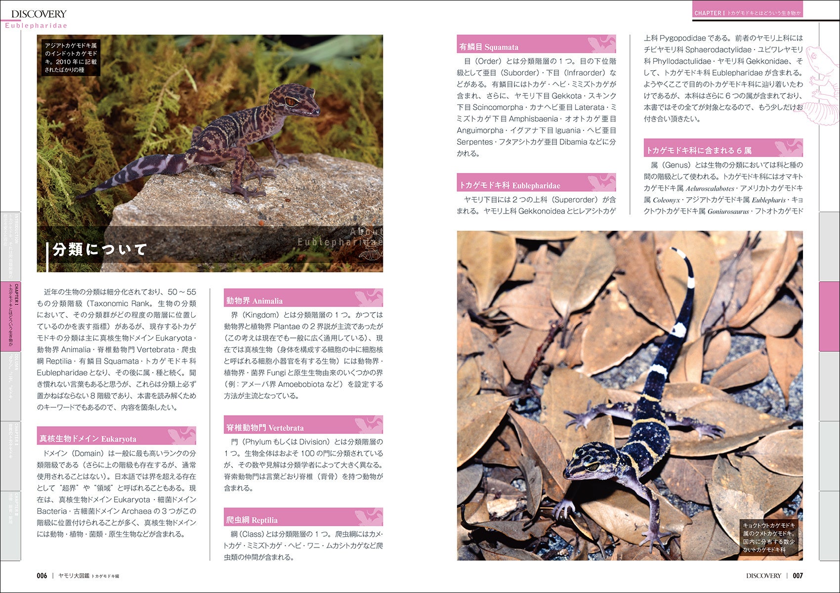 『ヤモリ大図鑑』で扱わなかった「トカゲモドキ科」をおさえる書籍となり、ヤモリの仲間は本書で完全に網羅します。
