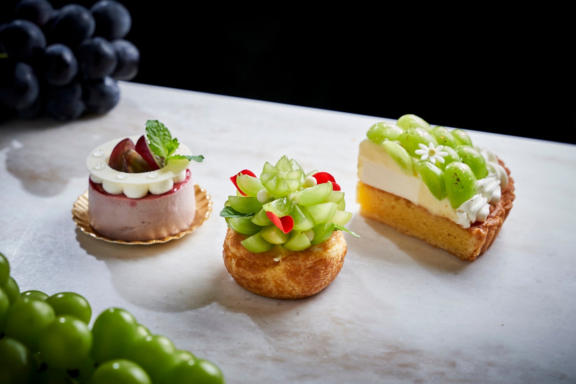 旬のシャインマスカットと巨峰などのぶどうをさまざまにアレンジした爽やかなアフタヌーンティー。ぶどうの瑞々しさと甘さを贅沢に味わうスイーツとして、シャインマスカットのパンナコッタやタルト、その他マカロンやロールケーキ、レーズンサンドなどが揃います。セイボリーには、巨峰、シャインマスカットとブリーチーズのカナッペや、レモングラスジュレに小海老とシャインマスカットを添えた爽やかな一品などシェフのオリジナリティが溢れます。