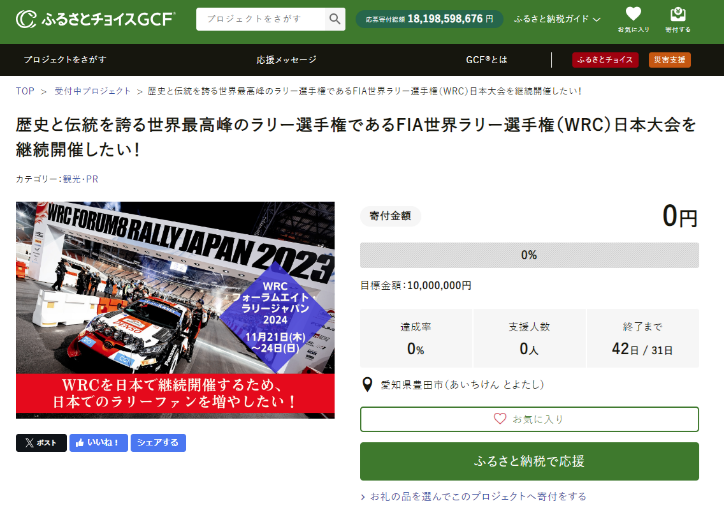 愛知県県豊田市とふるさとチョイス、ふるさと納税制度を活用したガバメントクラウドファンディング®で、FIA世界ラリー選手権日本大会の継続開催を目的としたプロジェクトを開始
