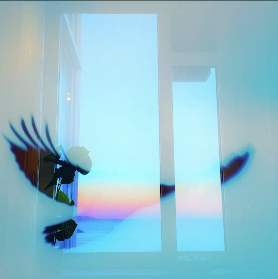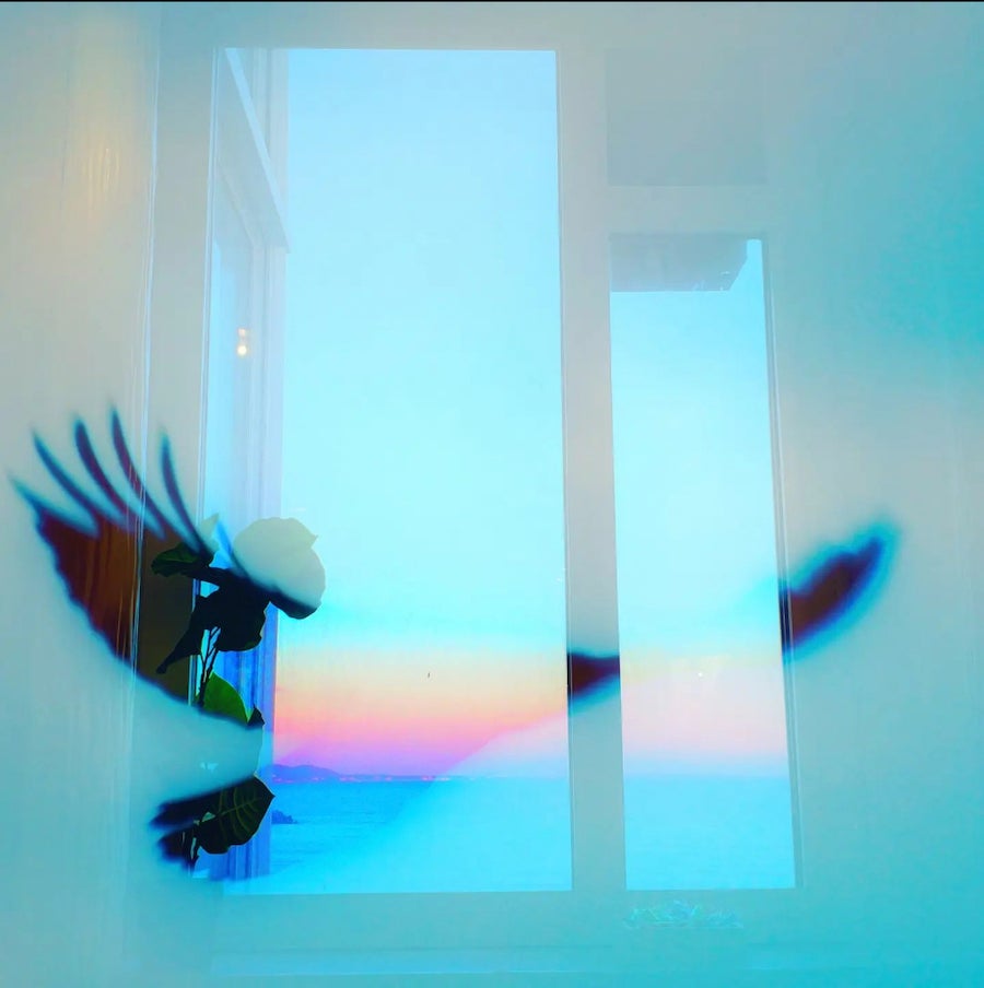 窓から見える江の島の海と夕焼け。そこには映り込まなかった空に飛び交う鳶を重ねた一枚。「見えてる現実と見えない現実」をイメージに仕上げた写真。