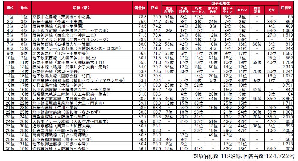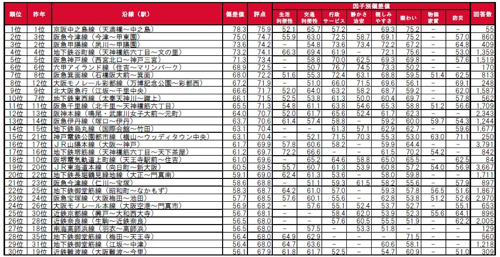街の住みここち沿線ランキング2024<関西版> TOP30の因子別評価&順位