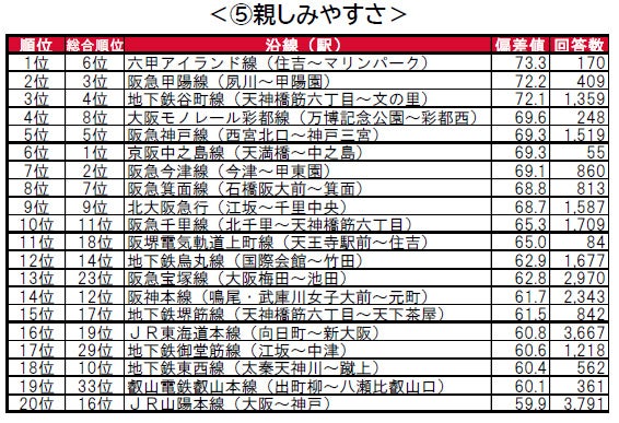 •本ランキングは、関西エリアの居住者を対象に、2020年~2024年の5年分の回答を累積し、回答者数50名以上の沿線を対象に、回答者の最寄り駅を沿線ごとに集計し、平均値からランキングを作成しています。