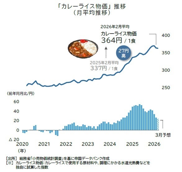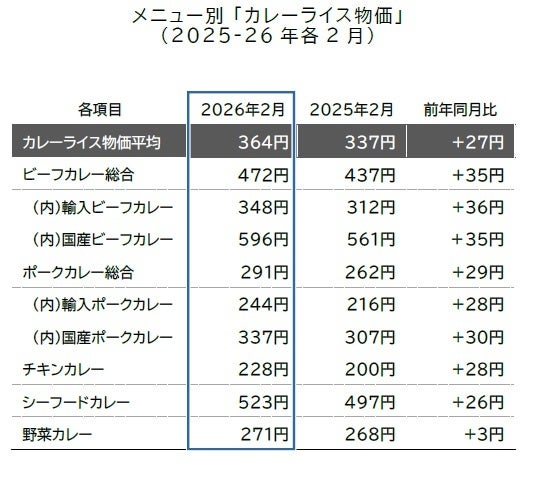 2026年2月のカレーライス物価平均は1食364円(前年336円)となった。