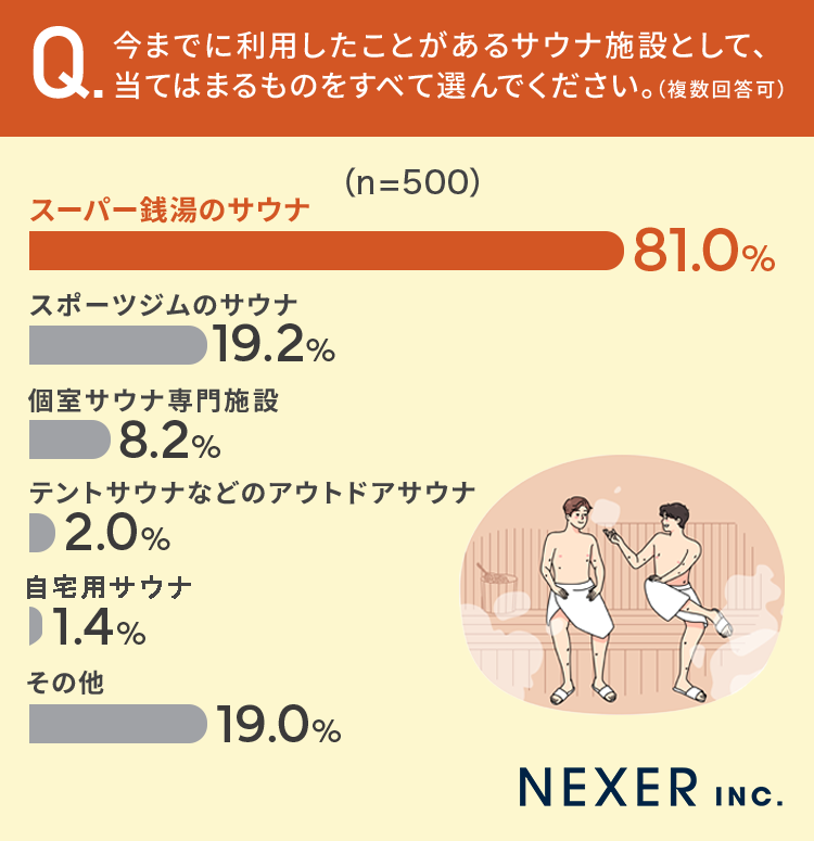81%の方が「スーパー銭湯のサウナ」を利用したことがある、と回答していました。