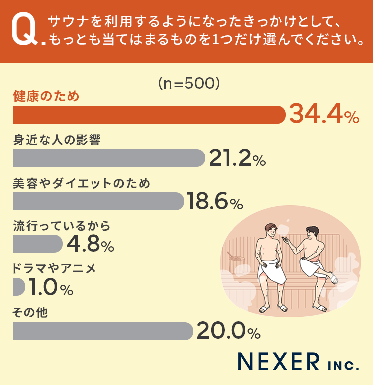■サウナを利用するようになったきっかけ、34.4%が「健康のため」