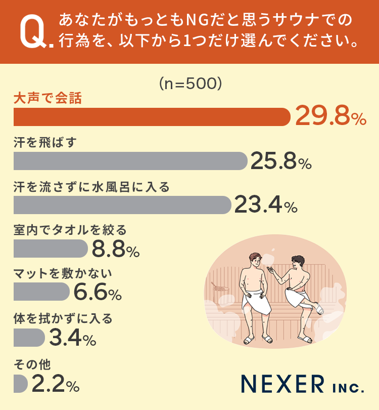 【サウナ利用経験者500人に調査】もっともNGだと思うサウナでの行為は「大声で会話」が1位に