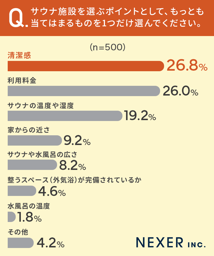 ■サウナ施設を選ぶポイント、「清潔感」と「利用料金」が並ぶ結果に