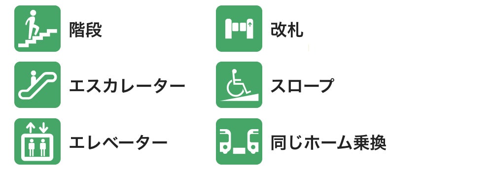 急いでいる際にもわかりやすいように、車両ごとに6種類のアイコン(階段、エスカレーター、エレベーター、改札、スロープ、同じホーム乗換)で表示しています。