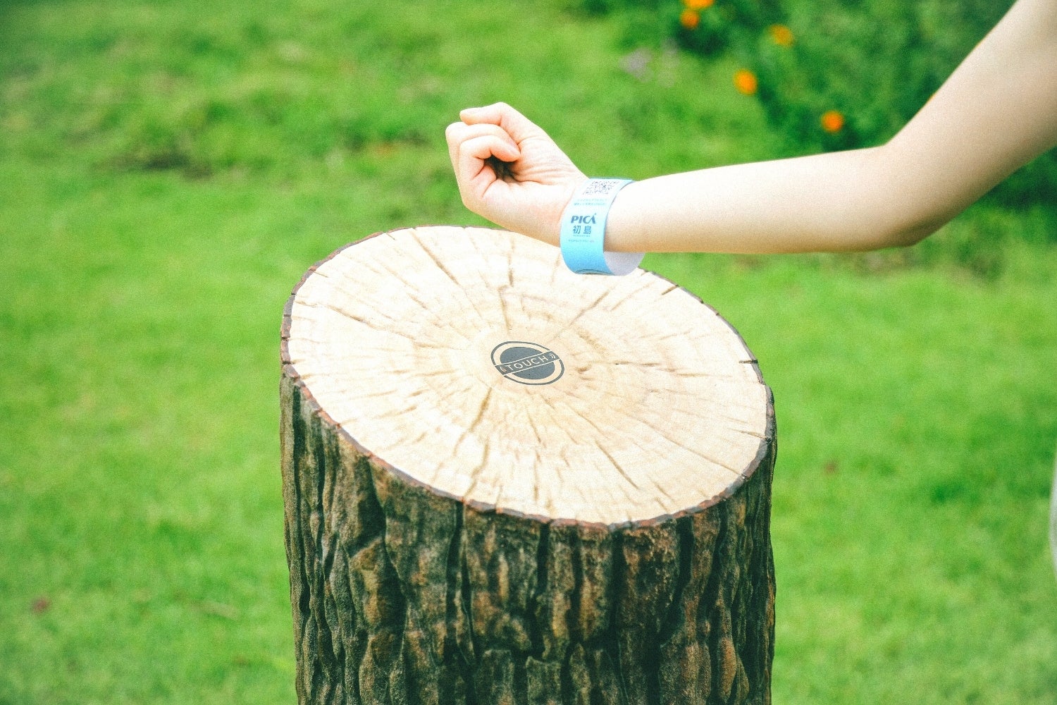 Myページにアクセス後、施設に複数設置した撮影スポットにある切り株デザインのNFC読取リーダーにリストバンドをかざすとアナウンスが流れ、普段撮ることのできない構図で写真を自動撮影できます。撮影した写真は、Myページからご確認いただけます。