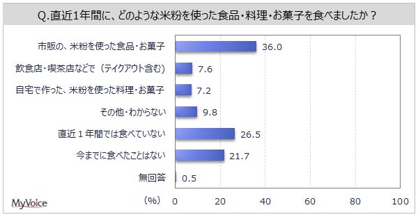 直近1年間に米粉を使った食品・料理・お菓子を食べた人は5割強です(以下、直近1年間に米粉食品を食べた人)。食べたものは(複数回答)、「市販の、米粉を使った食品・お菓子」が36.0%、「飲食店・喫茶店などで」「自宅で作った、米粉を使った料理・お菓子」が7~8%となっています。