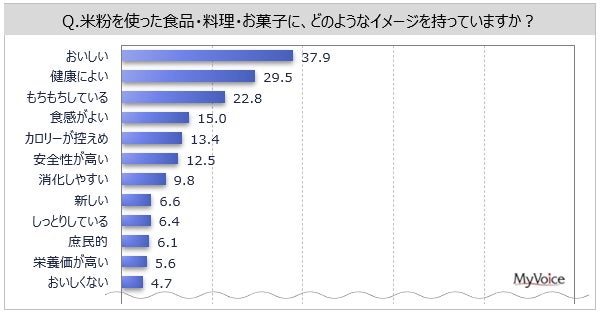 ■米粉食品のイメージは「おいしい」が4割弱、「健康によい」「もちもちしている」が各20%台、「食感がよい」「カロリーが控えめ」「安全性が高い」が各10%台