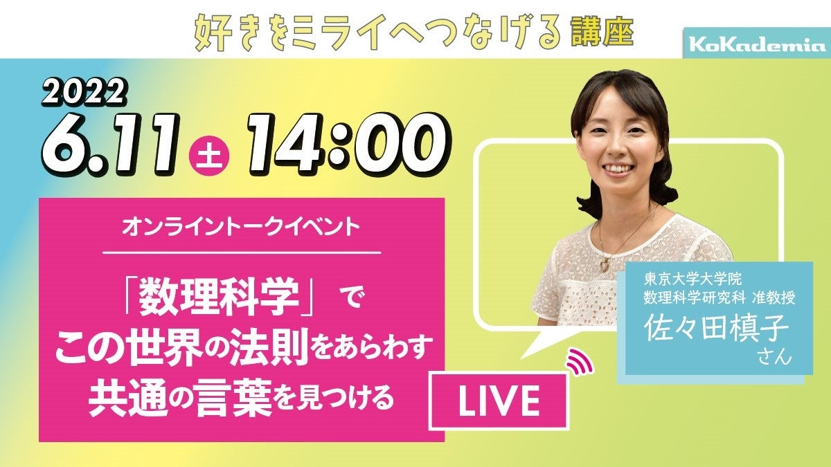 雑誌『子供の科学』を出版する株式会社誠文堂新光社(東京都文京区)は、2022年6月11日(土)に中高生向けのオンライントークライブ「好きをミライへつなげる講座」を開催。東京大学大学院 数理科学研究科准教授の佐々田槙子さんが登場します。