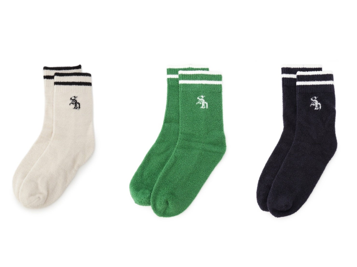 ソックスにもパイピングのラインを効かせ、カレッジライクなデザインに仕上げました。エンブレムロゴジャガードがアイキャッチになり、ギフトにも喜ばれる一点に。お揃いのルームウェアとトータルコーディネートでお楽しみください。