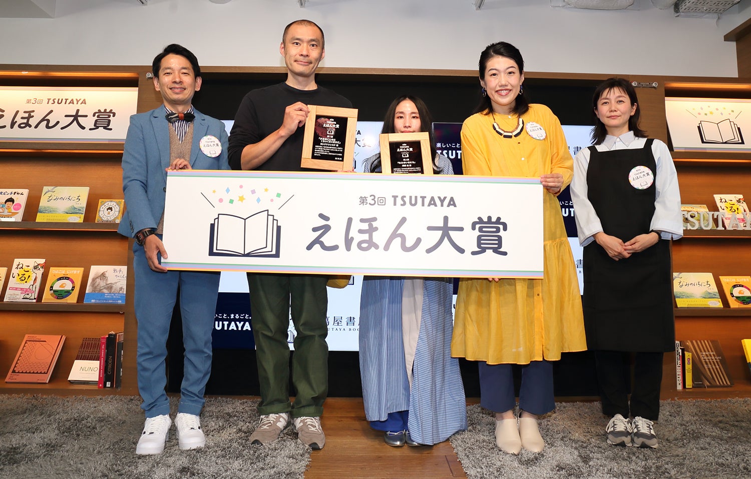 授賞式では、TSUTAYA・蔦屋書店で児童書に関わる全てのスタッフにより選ばれた受賞作品10タイトルと新人賞の発表に加え、1位・新人賞に選ばれた作品の授賞式を実施いたしました。3回目の開催となる今回は、授賞式に第1回「TSUTAYAえほん大賞」でもゲストでご登壇いただいたベビーシッターの資格を持ち、2人の女の子のお母さんである横澤夏子さんをゲストに、MCは前回に続き、保育士など育児に関する資格を多数取得しているタケトさんをお迎えしました。おふたりには、普段のご自宅での絵本の読み聞かせスタイルや、各作品への感想などを交えながら、授賞式を盛り上げていただきました。なお、受賞作品は、10月27日(木)より全国のTSUTAYAの書籍売り場にてコーナー展開をいたします。