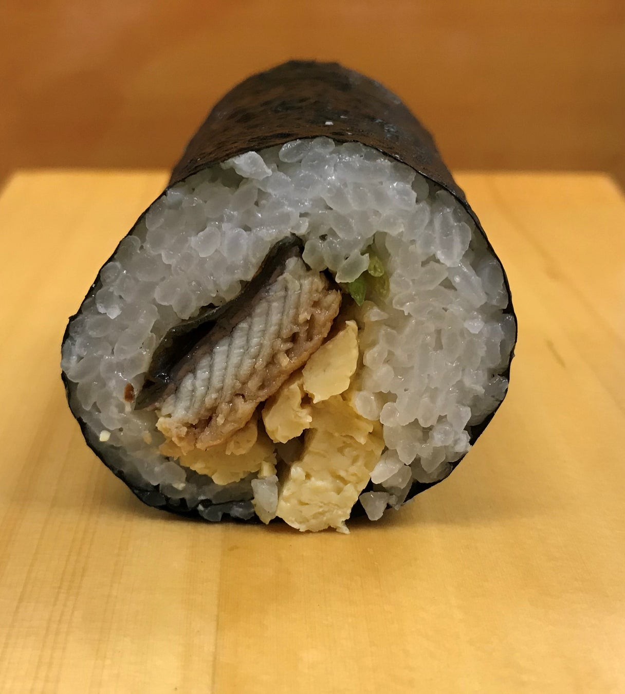 看板商品の厚焼き玉子の他、干瓢、椎茸、三つ葉、高野豆腐、胡瓜の6種を入れて巻き上げました。
