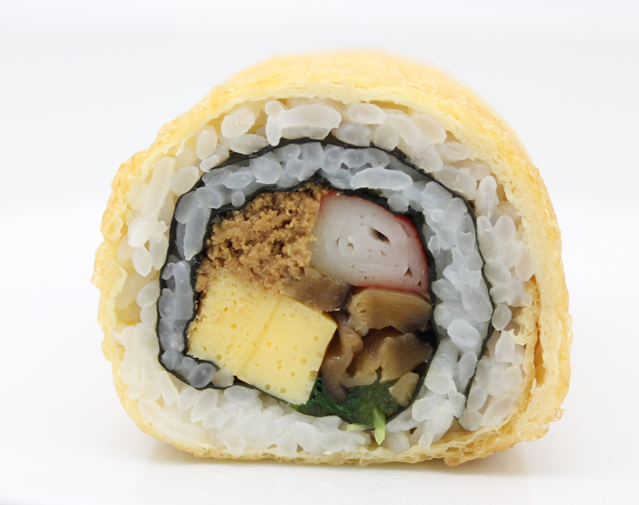 取りそぼろや椎茸を巻いた巻すしに、揚げシートを巻いて〆る、いなりの豆狸らしい恵方巻。