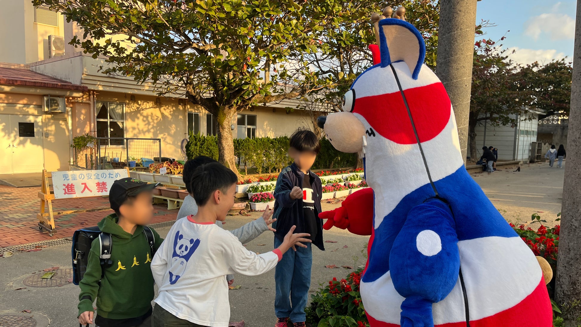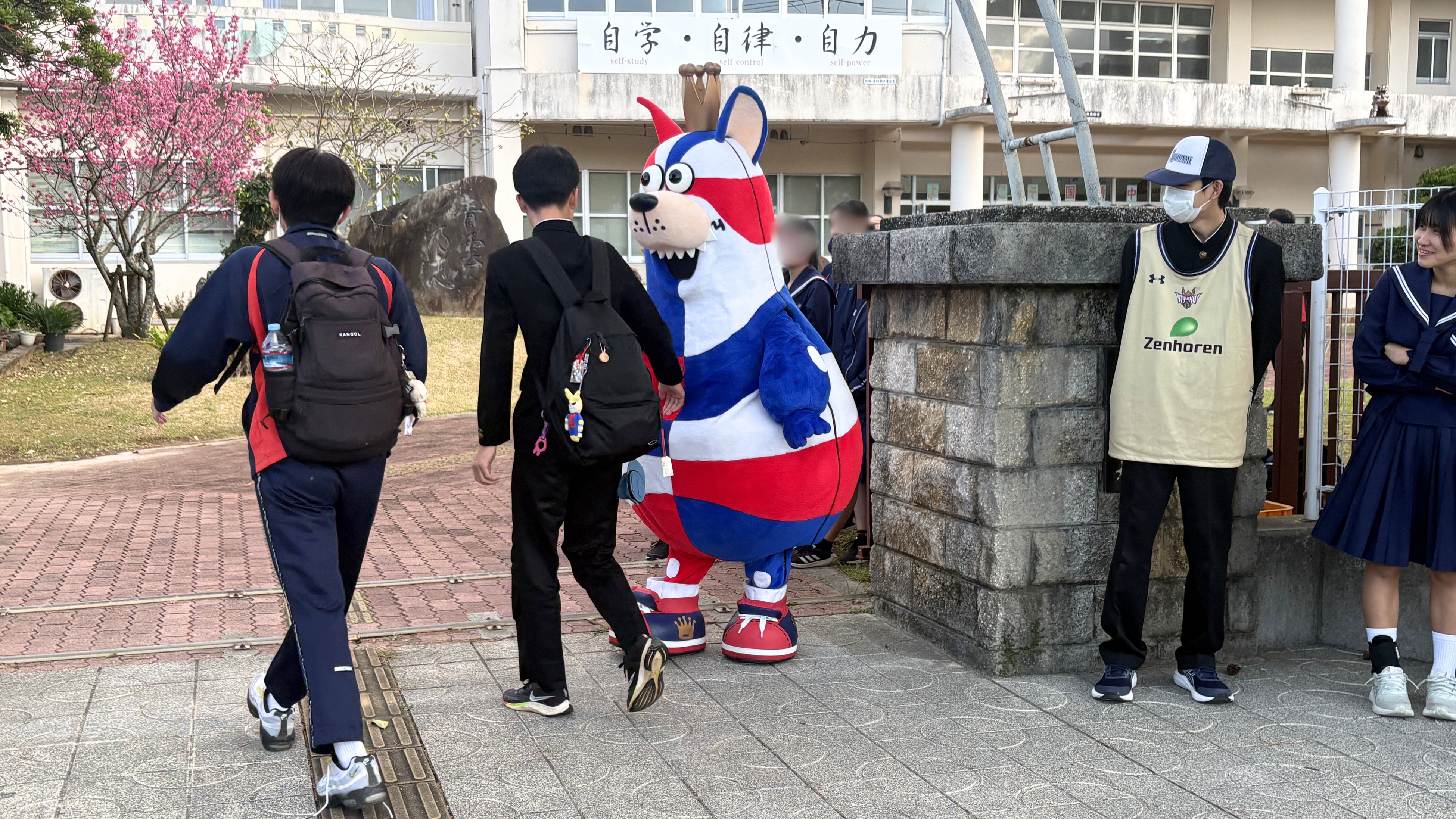 「おおきなわ」の活動の一環として実施している「ゴーディーによる朝のあいさつ運動」において、2月はホームタウン沖縄市、うるま市、国頭村の小中学校を訪問し、あいさつ運動に参加いたしました。ご協力いただいた各学校の皆さま、ありがとうございました。