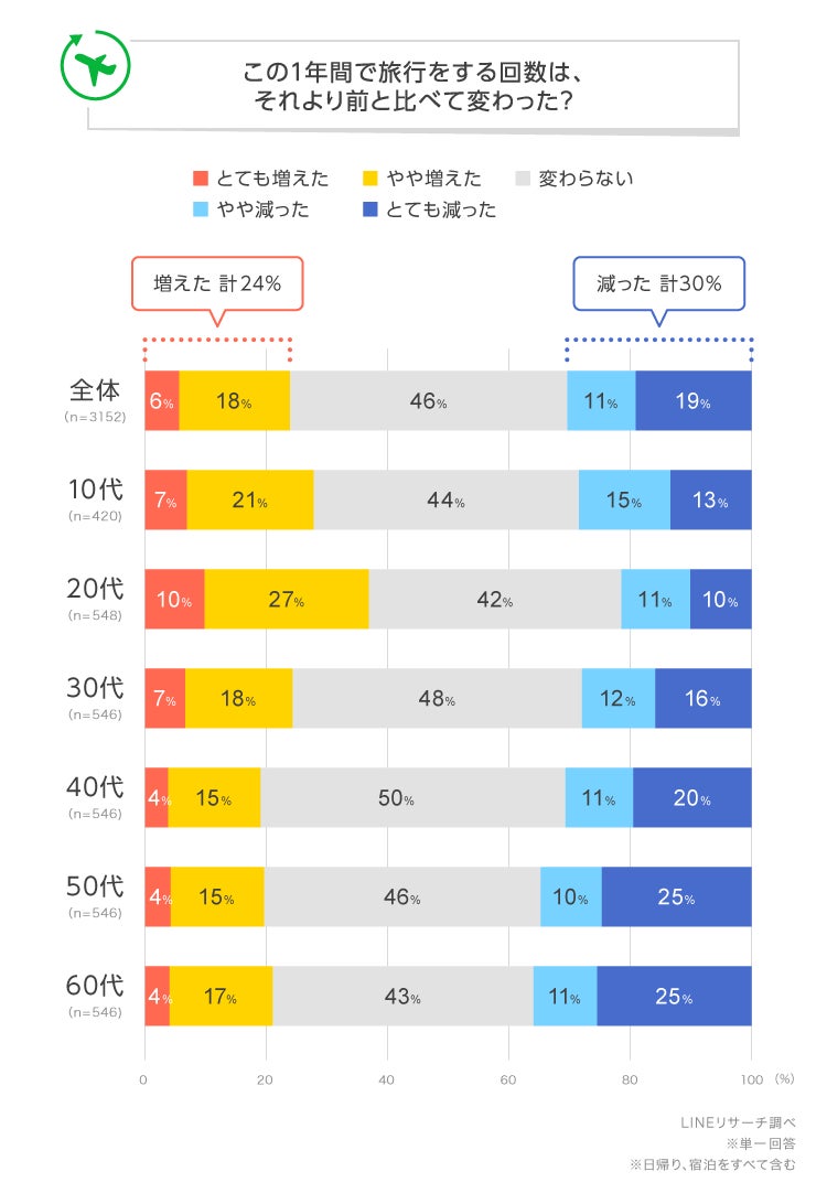 全体では「変わらない」が4割台半ばで最多となり、旅行回数に大きな変化がなかったことがわかりました。