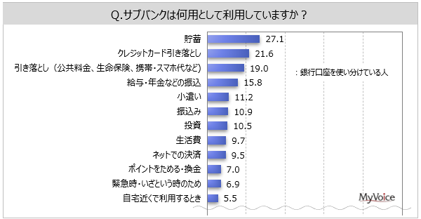銀行口座を使い分けている人の、サブバンク口座の利用目的は(複数回答)、「貯蓄」が27.1%、「クレジットカード引き落とし」が21.6%、「引き落とし(公共料金など)」が19.0%です。メインバンク口座の利用目的と比べて「貯蓄」が上位、「生活費」「給与・年金などの振込」が下位となっています。