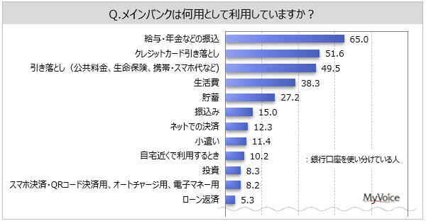メインバンク別の1位は、『PayPay銀行』利用者では「スマホ決済・QRコード決済用、オートチャージ用、電子マネー用」、『イオン銀行』『楽天銀行』利用者では「クレジットカード引き落とし」となっています。