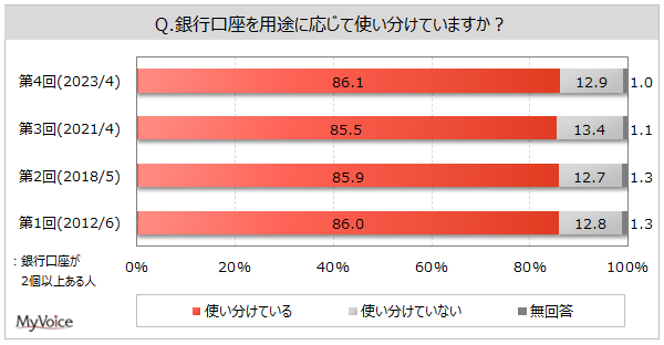 ■複数口座所有者のうち、用途に応じて銀行口座を使い分けている人は約86%