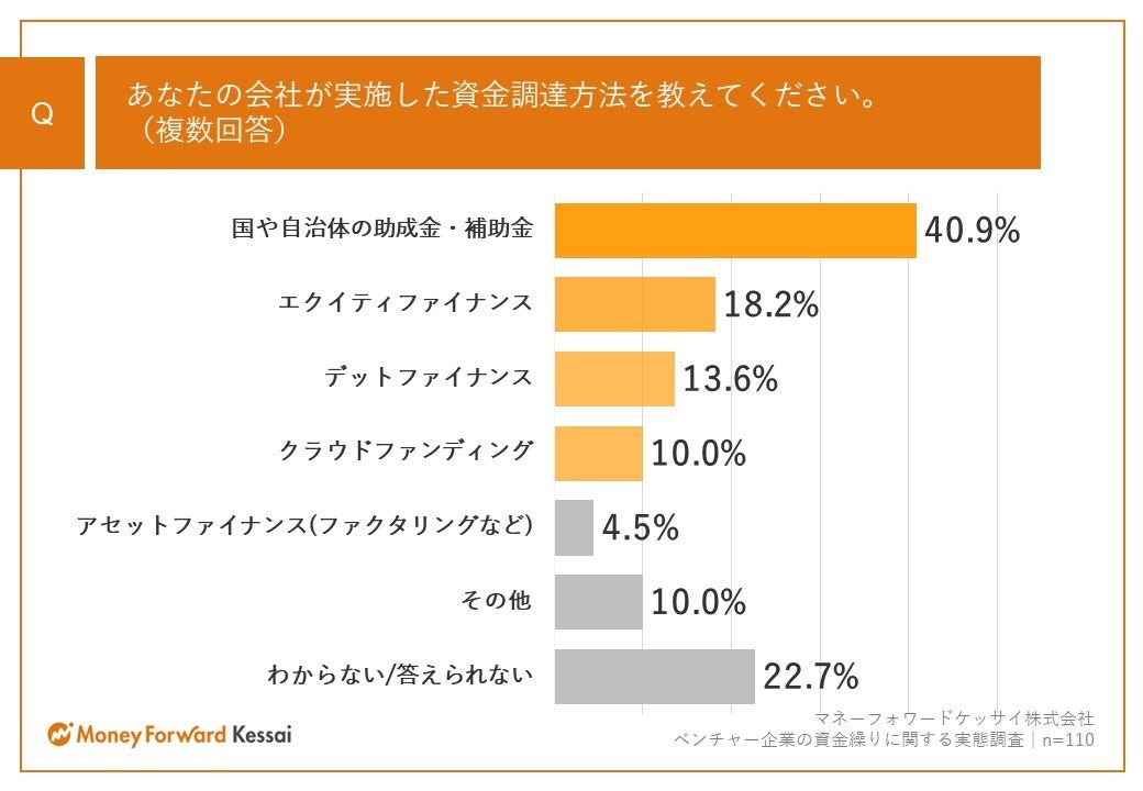 「あなたの会社が実施した資金調達方法を教えてください。(複数回答)」と質問したところ、「国や自治体の助成金・補助金」が40.9%、「エクイティファイナンス」が18.2%、「デットファイナンス」が13.6%という回答となりました。なお、その他には「自己資金」「銀行からの借入」「親族からの借入」という回答がありました。