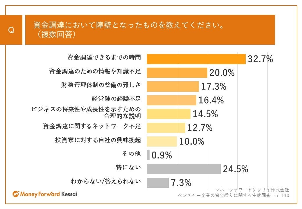 「資金調達において障壁となったものを教えてください。(複数回答)」と質問したところ、「資金調達できるまでの時間」が32.7%、「資金調達のための情報や知識不足」が20.0%、「財務管理体制の整備の難しさ」が17.3%という回答となりました。