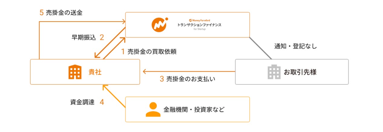 当社が提供する『マネーフォワード トランザクションファイナンス for Startups』は、企業の売掛債権を売却いただくことで早期に資金化できるサービスです。審査通過後、最短翌営業日に資金化ができるため、エクイティ調達までの繋ぎ資金が必要な場合や、資金調達までの時間を伸ばし、納得がいく条件で調達をしたいという場合に活用いただけます。