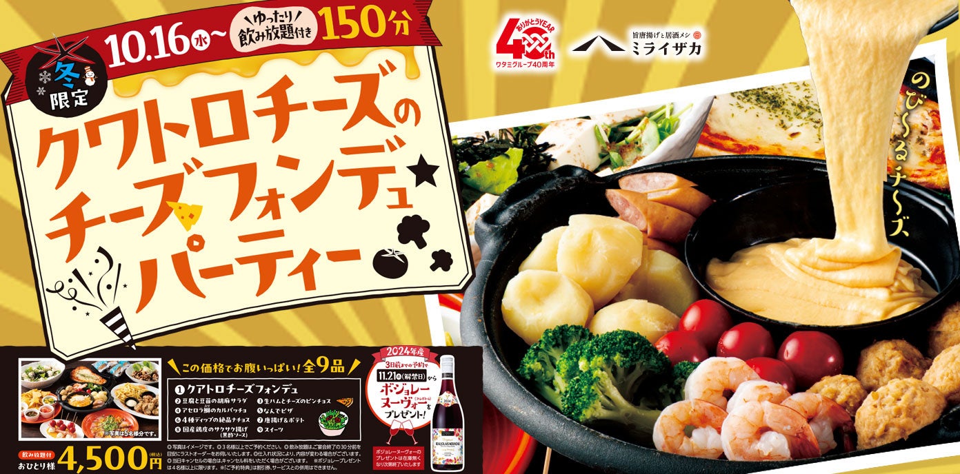 ミライザカでは、10月16日(水)からリニューアルする宴会ラインナップに、冬季限定コースとして「チーズフォンデュ★パーティ」コースを新設します。これまでミライザカでは、お鍋と名物から揚げがメインのコースが定番となっていましたが、今回の「チーズフォンデュ★パーティ」コースでは、4種のチーズを使ったクワトロチーズフォンデュをメインに、チーズのピンチョス、カルパッチョなどお手軽でお酒と合わせやすいメニューを集めました。