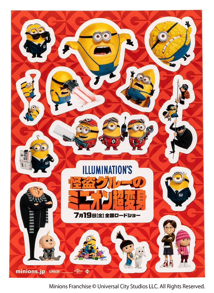 映画公開を記念してご来店のお客様に『怪盗グルーのミニオン超変身』のステッカーを1枚プレゼントいたします。スマートフォンや手帳に貼ったり、いろいろな使い方でハチャメチャミニオンたちと一緒に毎日を楽しんで!