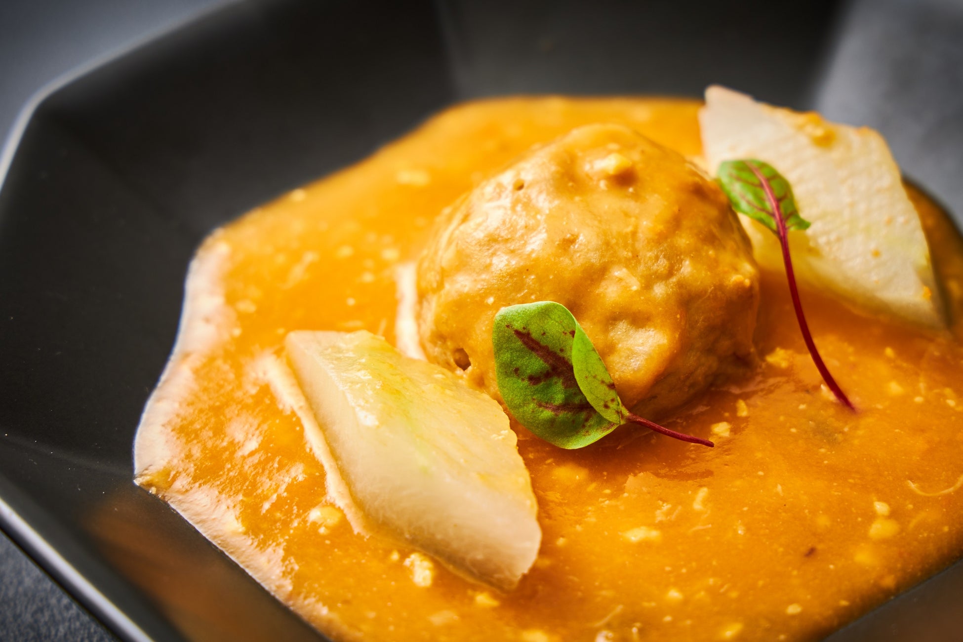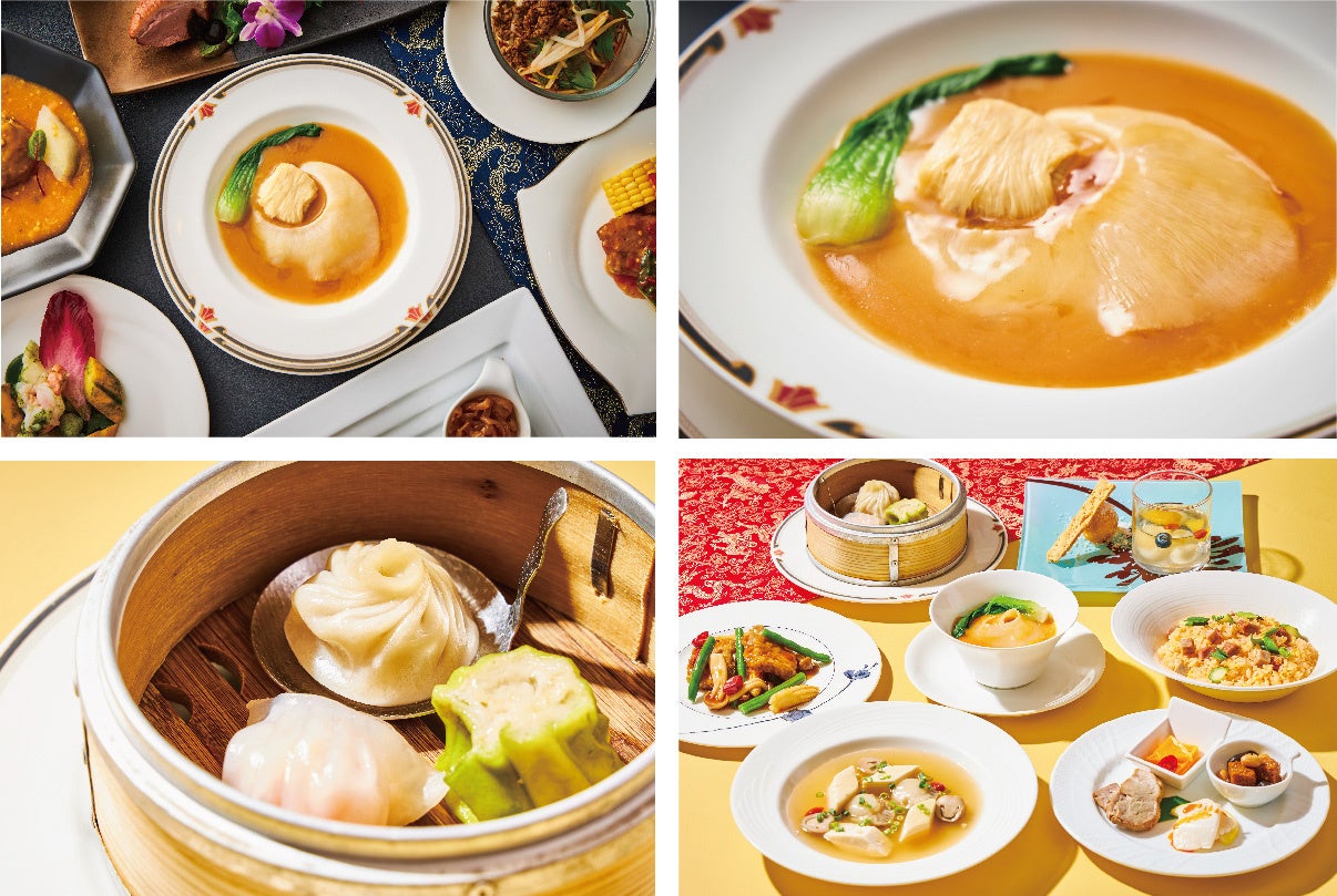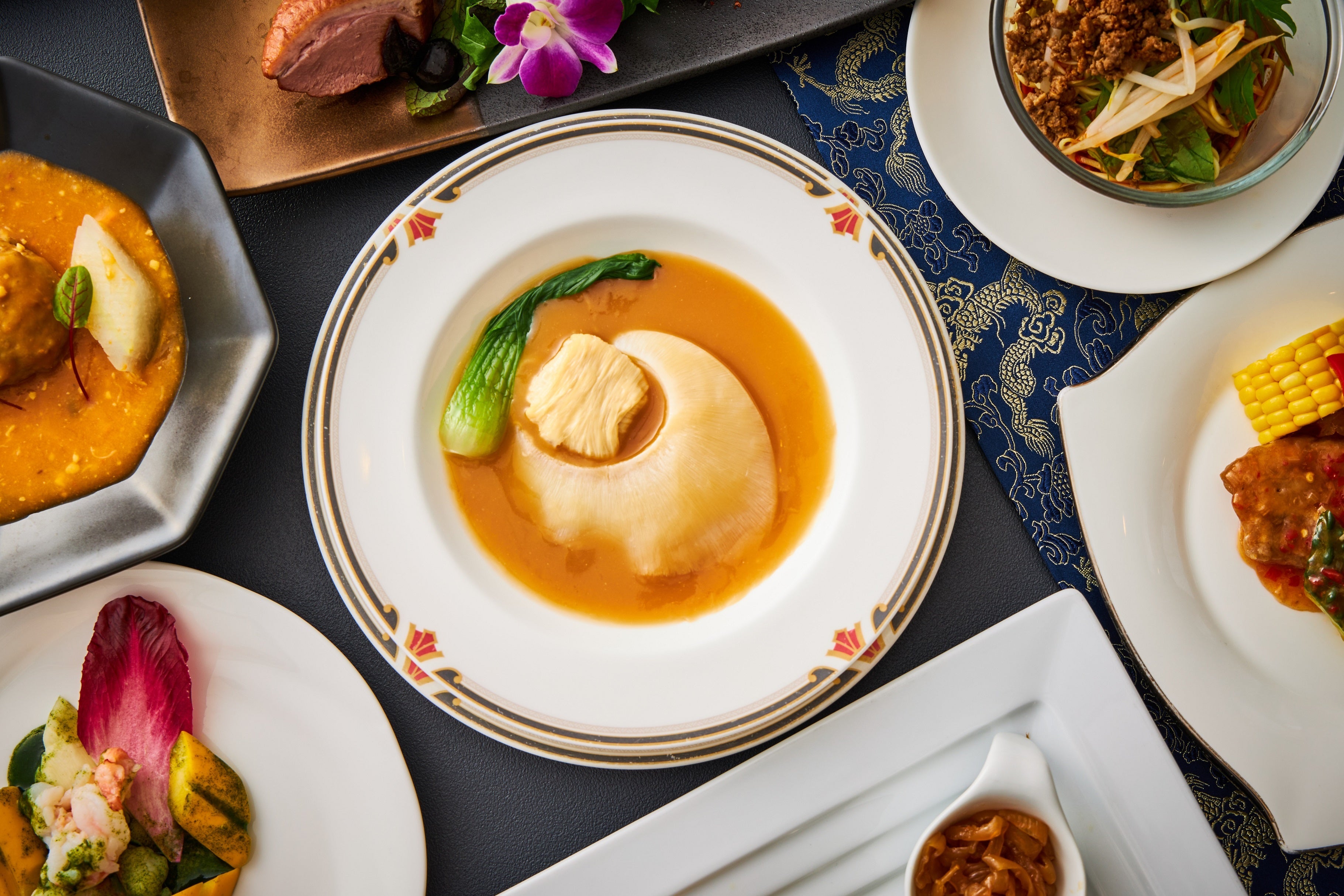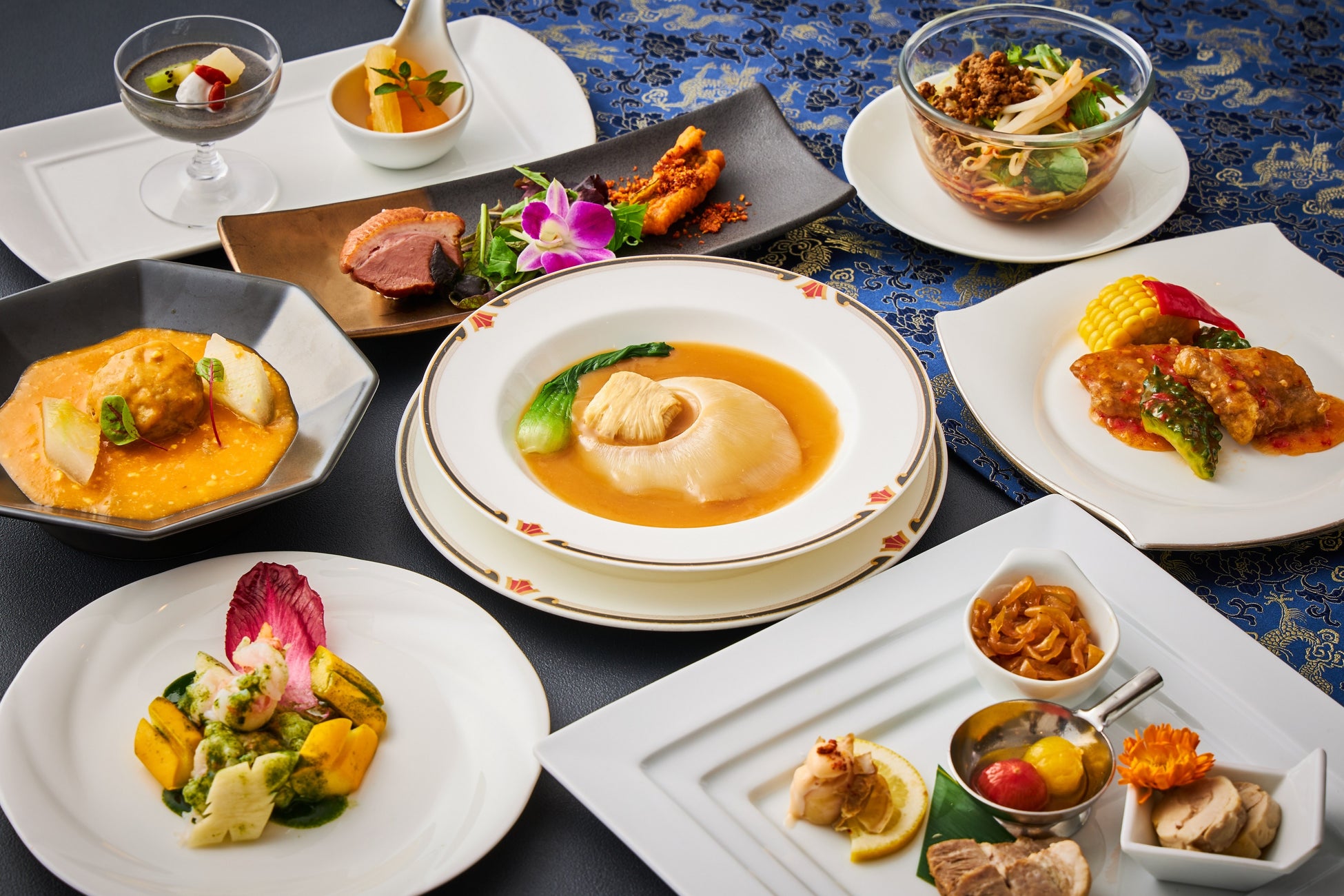 バランス良く仕上げた全8品のおもてなし料理をご用意いたしました。厚みのあるふかひれを贅沢に一枚使用した“ふかひれ姿煮 蒸し湯葉添え”では「紅焼(ほんしゃお)」と呼ぶ、中国の伝統的な味付けでとろみのある醤油風味煮込みを湯葉と一緒にご堪能ください。濃厚な味の後は、爽快な青ネギの香りが特徴的でさっぱりとした味わいの“海老と季節野菜 翡翠ソース炒め”をお召し上がりください。ほど良く脂がのったジューシーな鴨肉と夏の滋養食の穴子を使用し、桂林ならではのスパイシーな味付けが食欲をそそる“四川ダックロース・穴子のスパイシー揚げ”は夏バテ予防にぴったりな一品です。上海蟹味噌の濃厚さを堪能すべく、ご用意するのは“大肉団子 上海蟹味噌煮込み”です。お食事は3種類からお選びいただけ、中でも独特の風味と旨辛が際立つ、夏ならではの“冷やし坦々麺”がおすすめです。食後のデザートでは濃厚な“黒胡麻プリン”と、ほどよい酸味と甘み、とろっとやわらかな口あたりが絶妙な“あんずのコンポート”をお楽しみください。