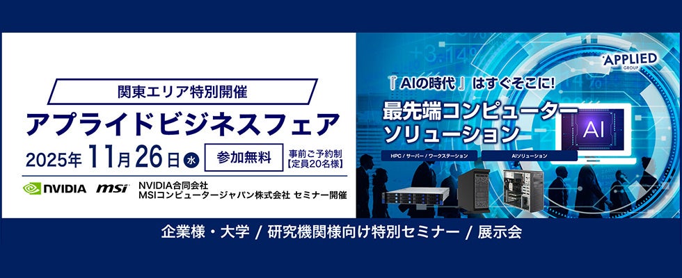 この度、エムエスアイコンピュータージャパン株式会社は、2025年11月26日(水)にアプライド株式会社が主催する「アプライドビジネスフェア」に登壇し、最新のAIスーパーコンピューター「MSI EdgeXpert」をご紹介いたします。