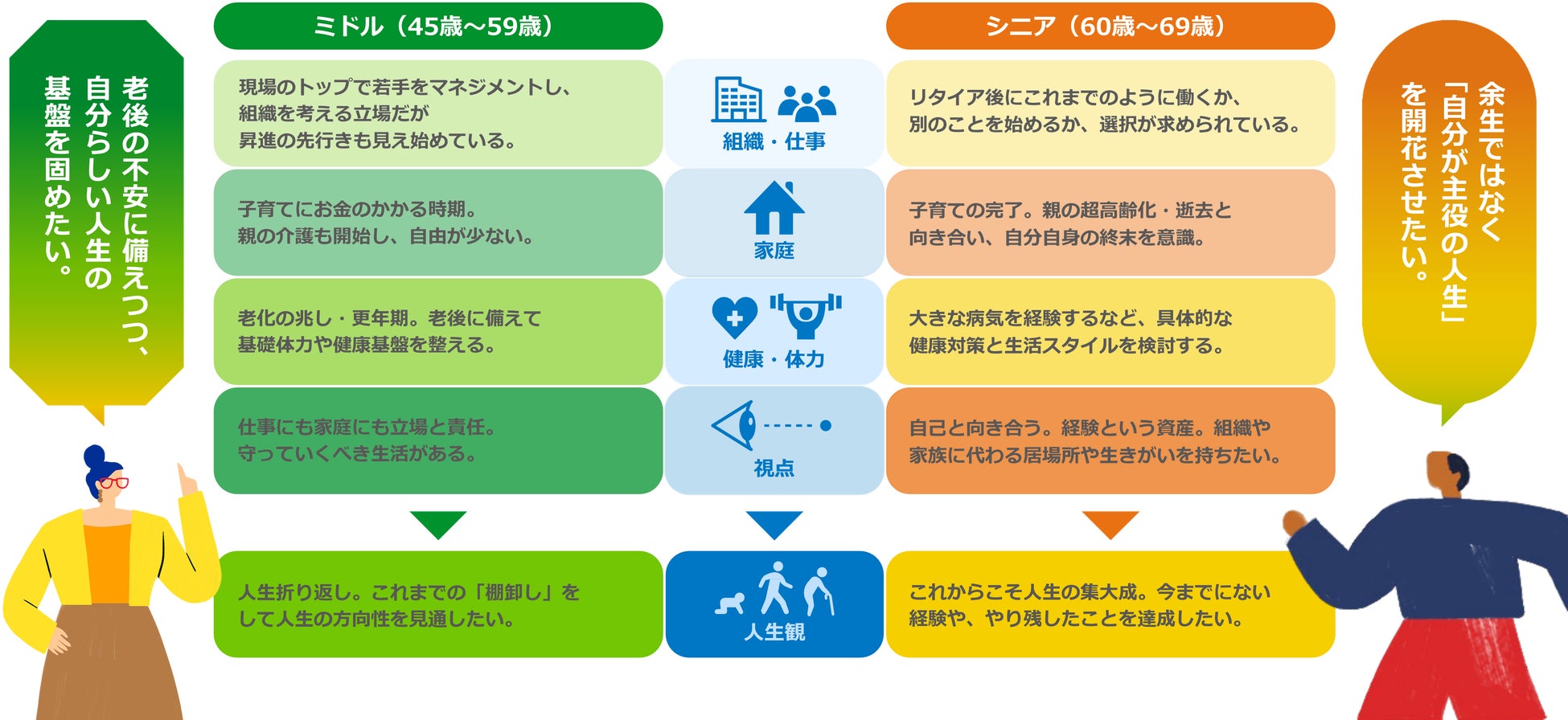 また、現代のミドル・シニア層は、社会環境の変化で「人生のゴール、モデルケース」が消失し、社会人人生のほとんどが不況であったため、希望の人生を果たせていないことが特徴として見られます。中でも、ミドル層は人生の後半に備えて自分らしい人生の基盤を固めたい傾向が強く、シニア層はただ漫然と余生を過ごすのではなく、「自分が主役の人生」を開花させたい願望が強い傾向がありました。